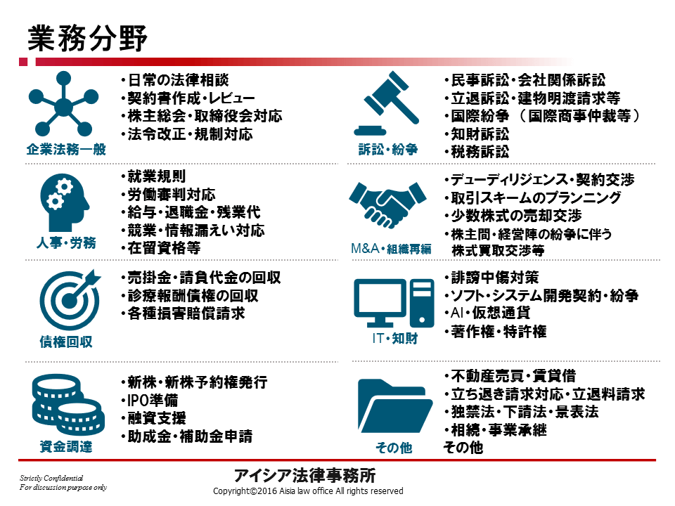 アイシア法律事務所は幅広い企業法務案件を取り扱っており、各分野に精通した弁護士が在籍しております。