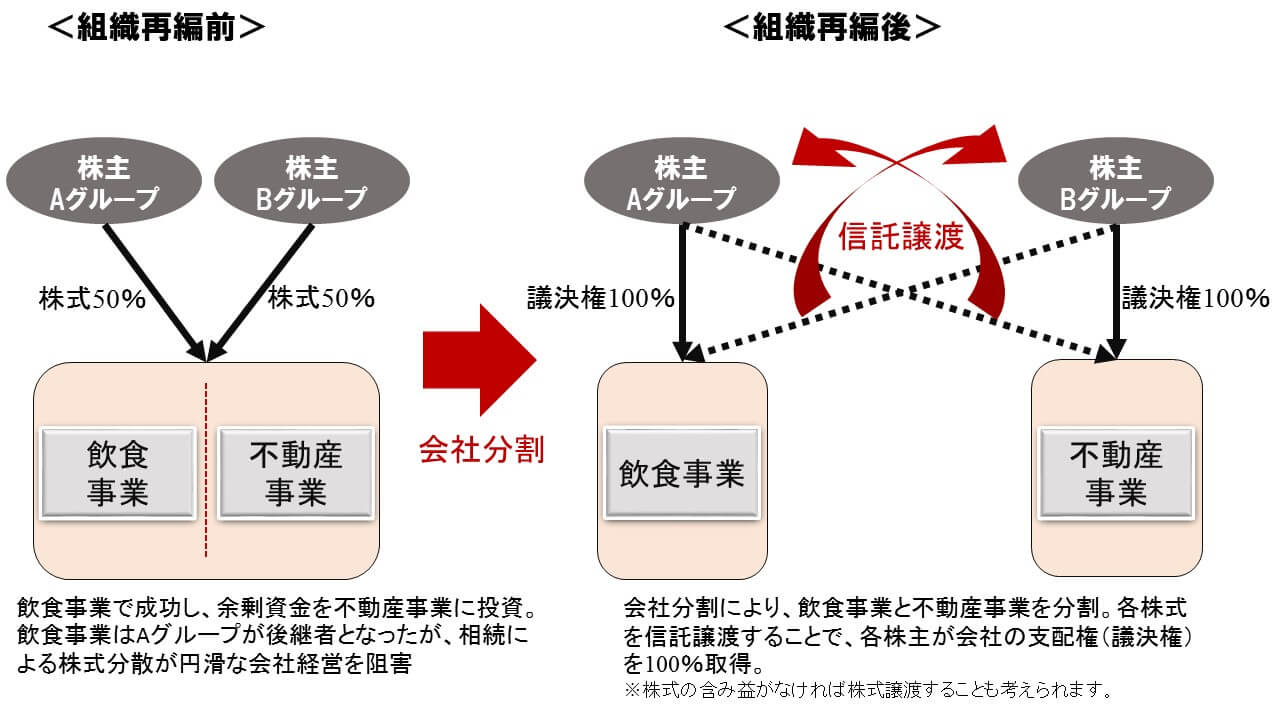 弁護士に相談したところ、会社分割によって飲食事業と不動産事業を営む2つの会社に分けた上で、各株主グループが保有する株式を相互に信託譲渡することによって、各株主グループがそれぞれ飲食事業と不動産事業の経営を行うことになりました。
