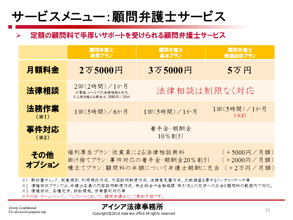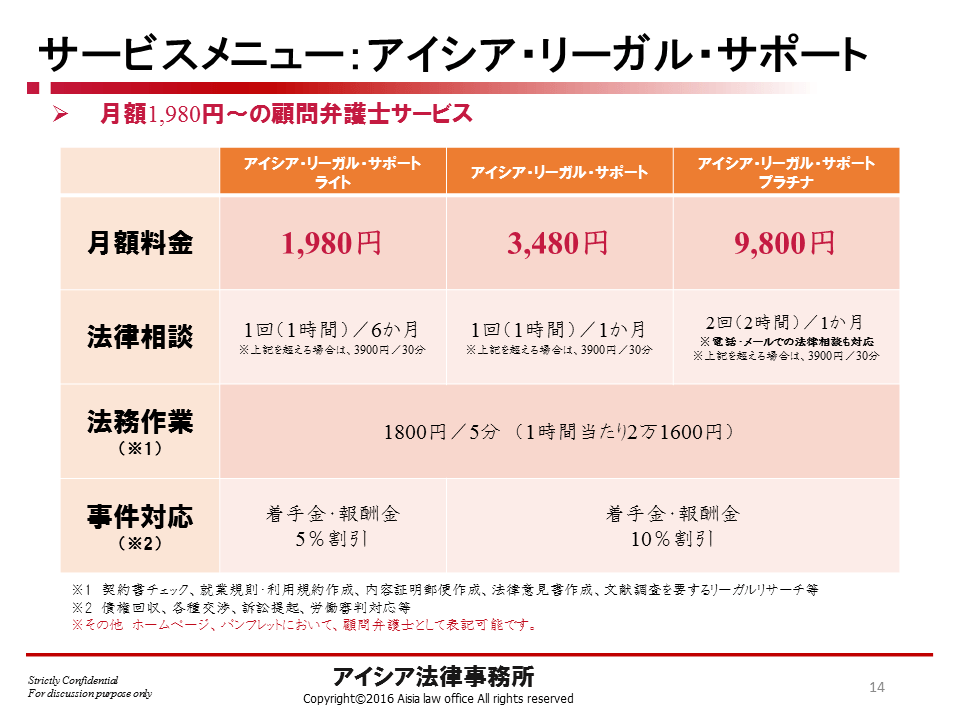 アイシア法律事務所では、月額1,980円からの顧問弁護士サービス(アイシア・リーガル・サポート)と定額の顧問料で手厚くサポートする顧問弁護士サービスを提供しております。