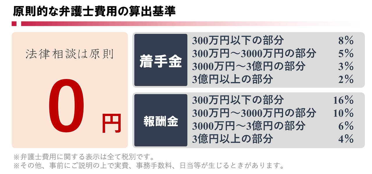 - なお、下記で示す弁護士報酬は目安であり、案件内容が簡易な場合には減額しております。ご相談いただく事案の概ね半分程度では下記より減額した金額をご提案することが可能です。
